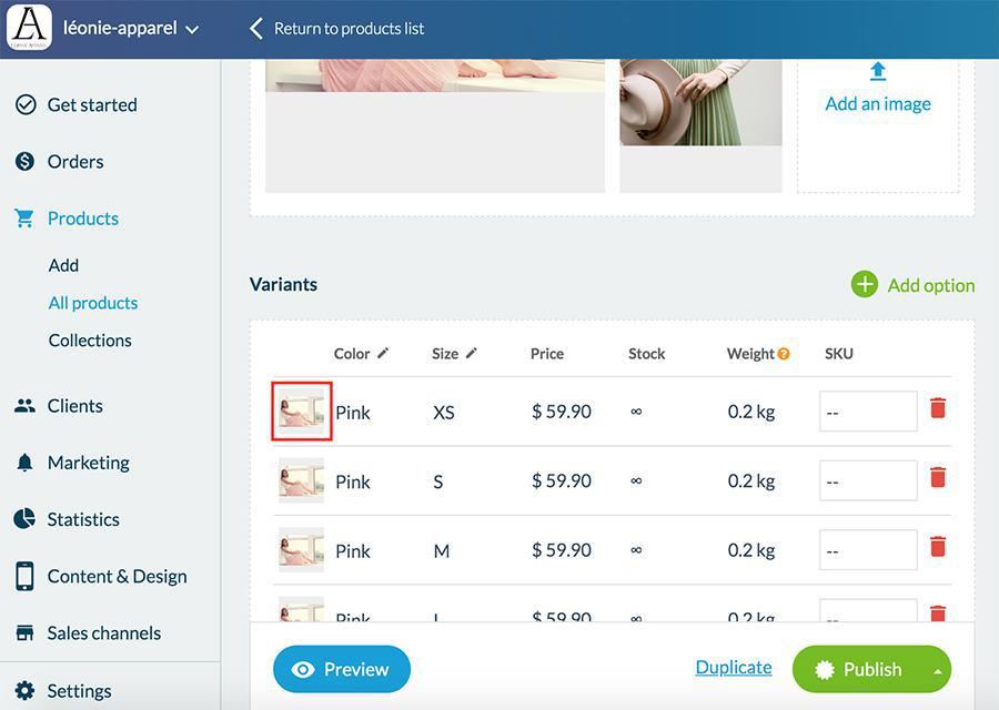 Note: you can only assign images to your variants that are shown in the slideshow in the "Images" section of the product page. If you have not yet added an image to your product page, refer to our dedicated online help.