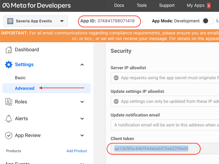 2. Scroll down to Security section on Facebook app and copy the "Client Token"