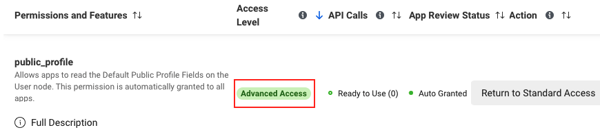 3. Confirm Advanced Access for public_profile (don't forget to check the box "I agree that any data I receive through public_profile will be used in accordance with the allowed usage.")