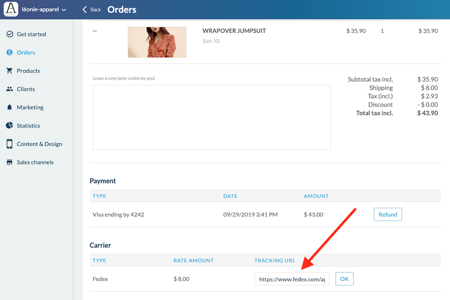 Go to the Orders page and select the order for which you want to add a tracking URL.