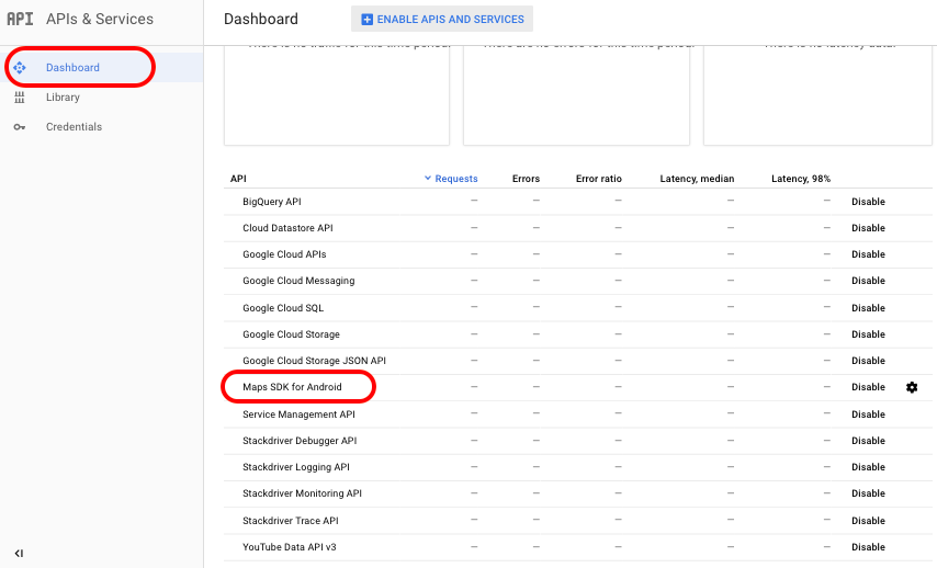 Once in the Google API menu, check if the Maps SDK for Android is enabled in the API Dashboard.